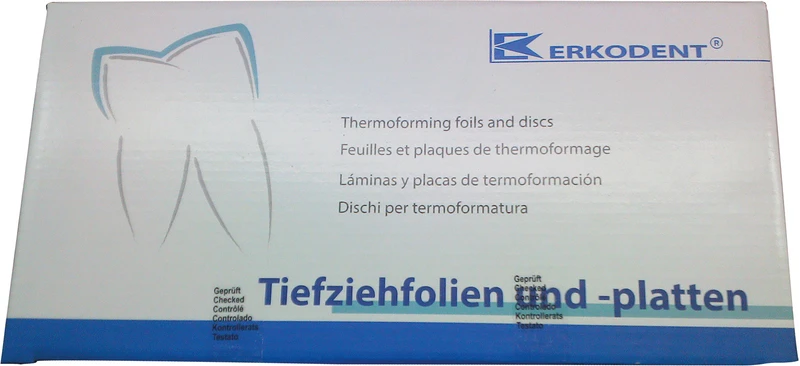 Erkodur ist eine zähharte, glasklare Folie. Äußerst schlagzäh. Sehr gut tiefziehbar. Verbindet sich mit Autopolymerisat. Kein Vortrocknen nötig. Mit Unterziehfolie als Schrumpfausgleichs- und Isolierfolie für Aufbiss-, Knirscher-, Stabilisierungs-, Drum- und Miniplastschienen, Verbandplatten, Gussformteilen.