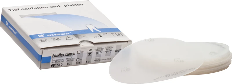 Erkoflex-bleach ist ein flexibles Material mit hoher Elastizität und Formbeständigkeit. Verbindet sich nicht mit Autopolymerisat. Zur Herstellung von Bleachingschienen, Fluoridierungsschienen, Medikamententräger. Härte ca. 95 Shore A. Mit Unterziehfolie für Modellisolierung und Schrumpfausgleich.
