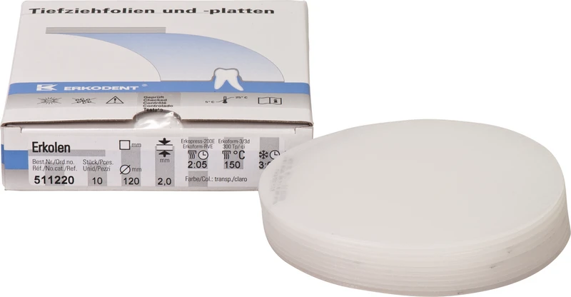 Erkolen ist ein weiches, elastisches Material, rückstandslos verbrennbar. Verbindet sich nicht mit Autopolymerisat. Für Gussformteile, provisorische Kronen und Brücken, Zahnfleischverbände und als Platzhalter für Medikamententräger (z. B. Fluoridierung) aus Erkoflex-Folien. Mit Unterziehfolie für Modellisolierung und Schrumpfausgleich.