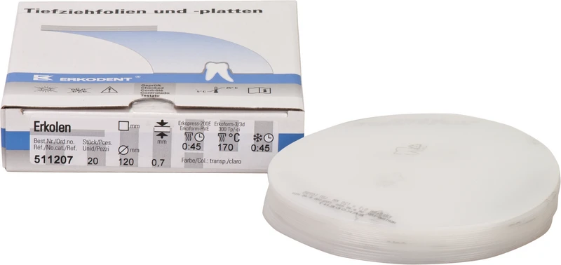 Erkolen ist ein weiches, elastisches Material, rückstandslos verbrennbar. Verbindet sich nicht mit Autopolymerisat. Für Gussformteile, provisorische Kronen und Brücken, Zahnfleischverbände und als Platzhalter für Medikamententräger (z. B. Fluoridierung) aus Erkoflex-Folien. Mit Unterziehfolie für Modellisolierung und Schrumpfausgleich.