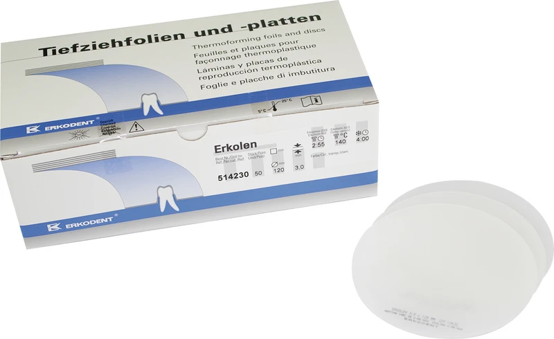 Erkolen ist ein weiches, elastisches Material, rückstandslos verbrennbar. Verbindet sich nicht mit Autopolymerisat. Für Gussformteile, provisorische Kronen und Brücken, Zahnfleischverbände und als Platzhalter für Medikamententräger (z. B. Fluoridierung) aus Erkoflex-Folien. Mit Unterziehfolie für Modellisolierung und Schrumpfausgleich.
