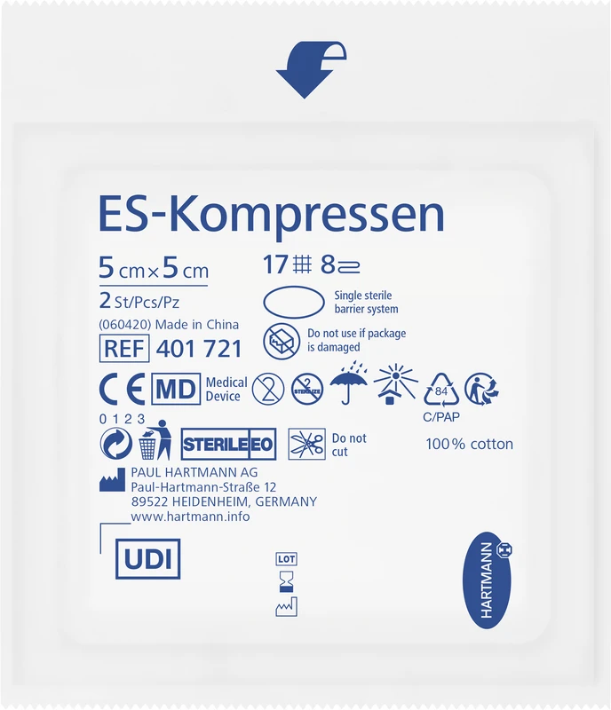 Die klassischen Mullkompressen mit den eingeschlagenen Schnittkanten.Aus Verbandmull EN 14079, 17-fädig, mit eingeschlagenen Schnittkanten (= ES); auch mehrfach aufgeklappt in größeren Formaten verwendbar, ohne dass störende Randfäden auftreten; gute Saugfähigkeit, luftdurchlässig, weich und geschmeidig.