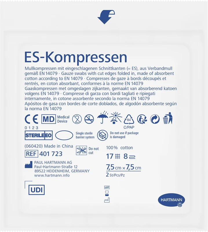 Die klassischen Mullkompressen mit den eingeschlagenen Schnittkanten.Aus Verbandmull EN 14079, 17-fädig, mit eingeschlagenen Schnittkanten (= ES); auch mehrfach aufgeklappt in größeren Formaten verwendbar, ohne dass störende Randfäden auftreten; gute Saugfähigkeit, luftdurchlässig, weich und geschmeidig.