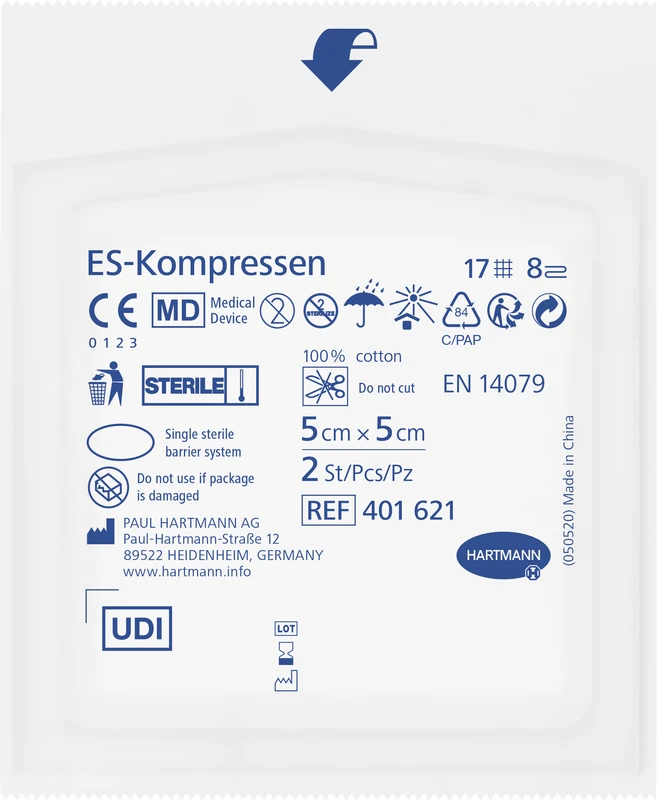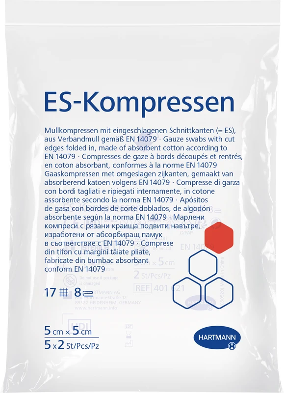 Die klassischen Mullkompressen mit den eingeschlagenen Schnittkanten.Aus Verbandmull EN 14079, 17-fädig, mit eingeschlagenen Schnittkanten (= ES); auch mehrfach aufgeklappt in größeren Formaten verwendbar, ohne dass störende Randfäden auftreten; gute Saugfähigkeit, luftdurchlässig, weich und geschmeidig.
