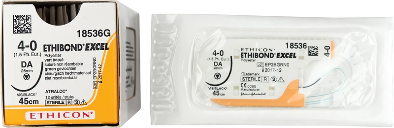 ETHIBOND EXCEL (Polyester beschichtet) ist ein synthetischer, nicht resorbierbarer chirurgischer Faden mit einer polyfilen Struktur, aber mit einer aus Polybutylat bestehenden Ummantelung, die für eine verbesserte Gleitfähigkeit durch das Gewebe verantwortlich ist.