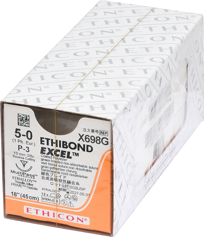 ETHIBOND EXCEL (Polyester beschichtet) ist ein synthetischer, nicht resorbierbarer chirurgischer Faden mit einer polyfilen Struktur, aber mit einer aus Polybutylat bestehenden Ummantelung, die für eine verbesserte Gleitfähigkeit durch das Gewebe verantwortlich ist.