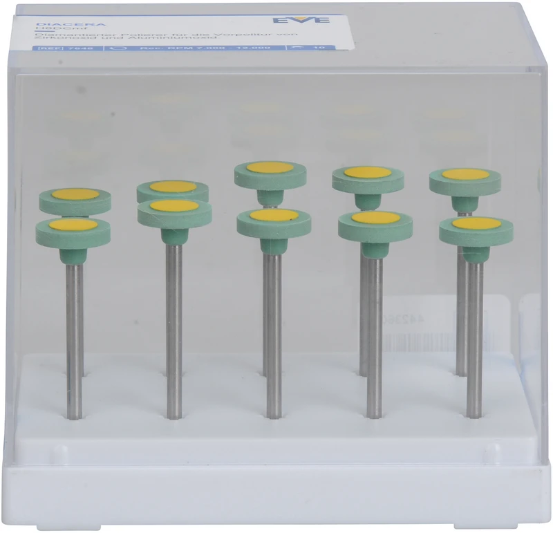 Hochleistungs-Diamantpolierer zum Glätten und Hochglanzpolieren von Keramiken, insbesondere für hochfeste Werkstoffe wie Zirkonoxid und Aluminiumoxid. Speziell für die Bearbeitung von CAD/CAM-Restaurationen.