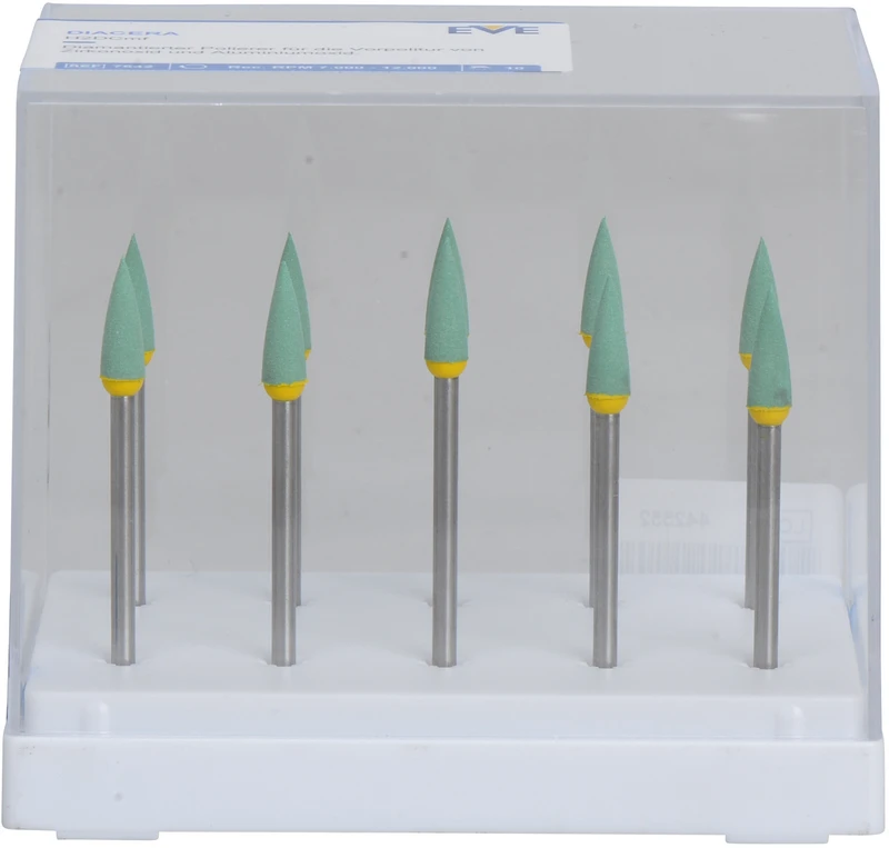 Hochleistungs-Diamantpolierer zum Glätten und Hochglanzpolieren von Keramiken, insbesondere für hochfeste Werkstoffe wie Zirkonoxid und Aluminiumoxid. Speziell für die Bearbeitung von CAD/CAM-Restaurationen.