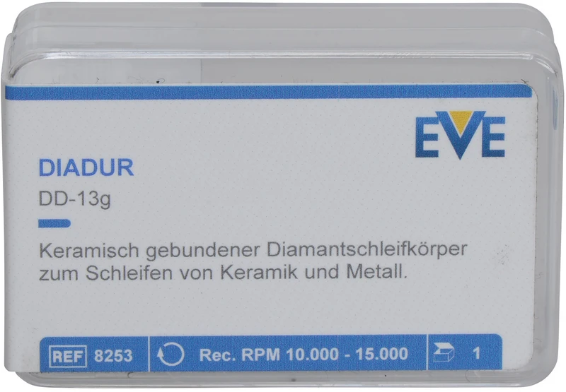 Diamantschleifkörper in keramischer Bindung für die Bearbeitung von Keramiken und Metallen. Ausdünnen der Kronenränder, ausarbeiten der Konturen. Verschleifen der Stege. Außergewöhnlich hohe Kantenstabilität. Sehr hohe Abtragsleistung, hohe Wärmetoleranz.