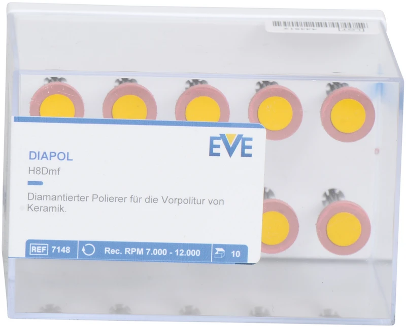 Verschleißfeste, leistungsstarke, mit reiner Diamantkörnung durchsetzte Polierer für brilliante Ergebnisse in Sekundenschnelle. Mit EVE Diamantpolierern erledigen Sie Korrekturen auf Keramik mit minimalem Aufwand. Abtragen, Glätten und Hochglanzpolieren.