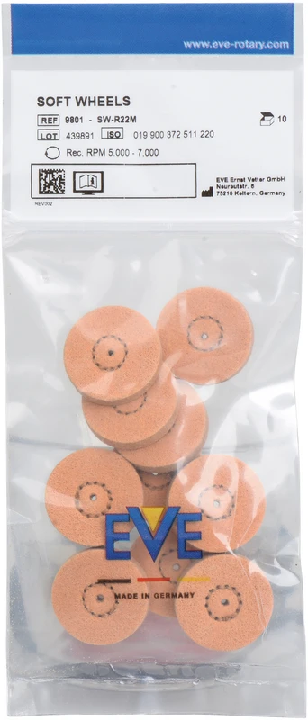 Hochglanz auf Acryloberflächen, Kunststoffen, Thermoplasten, weichbleibende Unterfütterungen und Metall. Die bereits mit Schleifmittel imprägnierten Polierscheiben erzeugen innerhalb weniger Sekunden einen außergewöhnlichen Hochglanz auf der zu bearbeitenden Oberfläche. Bei Einhaltung der angegebenen Drehzahl ist die beim Polieren entstehende Wärmeentwicklung gering. Dadurch arbeiten die EVE SOFTWHEELS materialschonend.