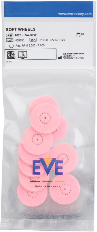 Hochglanz auf Acryloberflächen, Kunststoffen, Thermoplasten, weichbleibende Unterfütterungen und Metall. Die bereits mit Schleifmittel imprägnierten Polierscheiben erzeugen innerhalb weniger Sekunden einen außergewöhnlichen Hochglanz auf der zu bearbeitenden Oberfläche. Bei Einhaltung der angegebenen Drehzahl ist die beim Polieren entstehende Wärmeentwicklung gering. Dadurch arbeiten die EVE SOFTWHEELS materialschonend.
