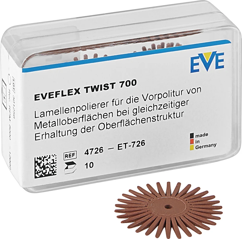 EVE TWIST schließt für den Zahntechniker die Lücke zwischen der Politur mit gebundenen Polierern und der anschließenden Hochglanzpolitur mit Bürstchen und Paste. EVE TWIST basiert auf dem Konzept dünner konkaver Scheiben, die je nach Anwendung in zwei oder mehr Lagen übereinander montiert werden können. Durch die neuartige Lamellenform und die übereinander montierte Anwendungsweise werden bei gleichzeitiger Erhaltung der ursprünglichen Oberflächenstruktur hochglänzende Ergebnisse erzielt.
