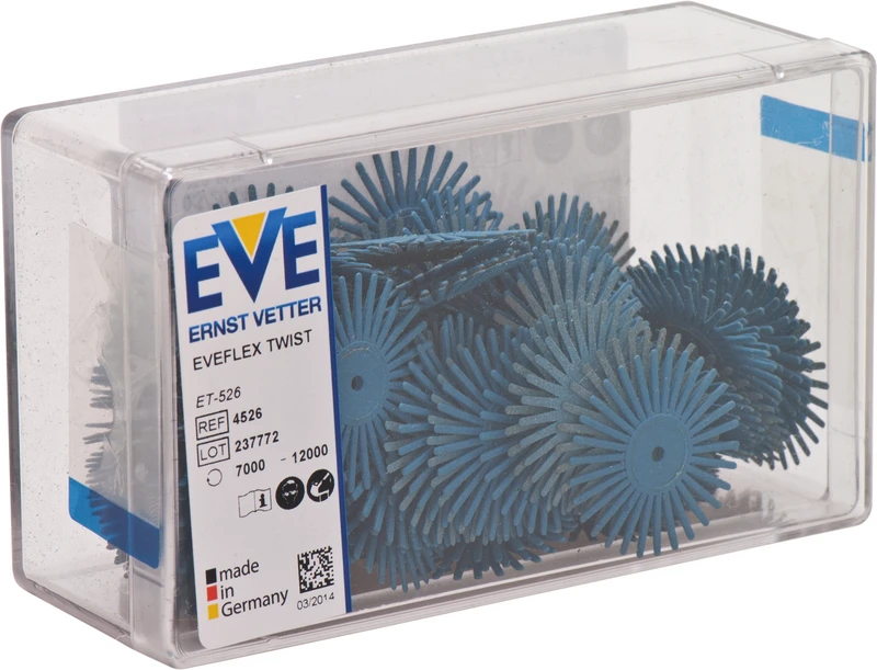 EVE TWIST schließt für den Zahntechniker die Lücke zwischen der Politur mit gebundenen Polierern und der anschließenden Hochglanzpolitur mit Bürstchen und Paste. EVE TWIST basiert auf dem Konzept dünner konkaver Scheiben, die je nach Anwendung in zwei oder mehr Lagen übereinander montiert werden können. Durch die neuartige Lamellenform und die übereinander montierte Anwendungsweise werden bei gleichzeitiger Erhaltung der ursprünglichen Oberflächenstruktur hochglänzende Ergebnisse erzielt.