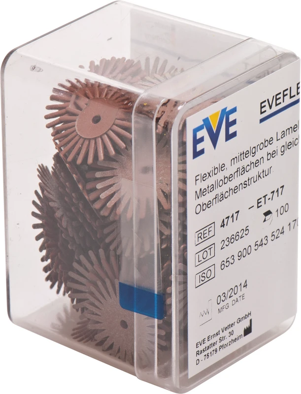 EVE TWIST schließt für den Zahntechniker die Lücke zwischen der Politur mit gebundenen Polierern und der anschließenden Hochglanzpolitur mit Bürstchen und Paste. EVE TWIST basiert auf dem Konzept dünner konkaver Scheiben, die je nach Anwendung in zwei oder mehr Lagen übereinander montiert werden können. Durch die neuartige Lamellenform und die übereinander montierte Anwendungsweise werden bei gleichzeitiger Erhaltung der ursprünglichen Oberflächenstruktur hochglänzende Ergebnisse erzielt.