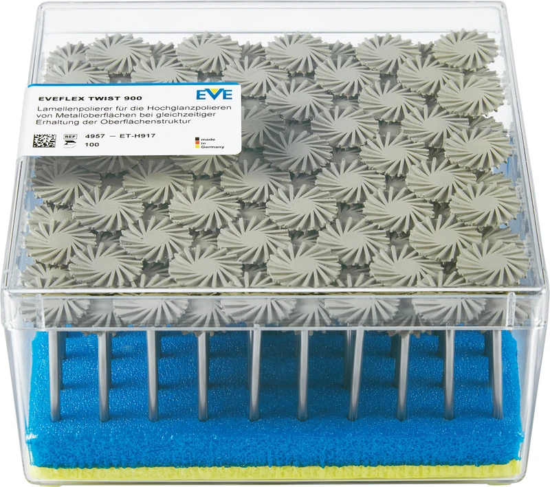 EVE TWIST schließt für den Zahntechniker die Lücke zwischen der Politur mit gebundenen Polierern und der anschließenden Hochglanzpolitur mit Bürstchen und Paste. EVE TWIST basiert auf dem Konzept dünner konkaver Scheiben, die je nach Anwendung in zwei oder mehr Lagen übereinander montiert werden können. Durch die neuartige Lamellenform und die übereinander montierte Anwendungsweise werden bei gleichzeitiger Erhaltung der ursprünglichen Oberflächenstruktur hochglänzende Ergebnisse erzielt.
