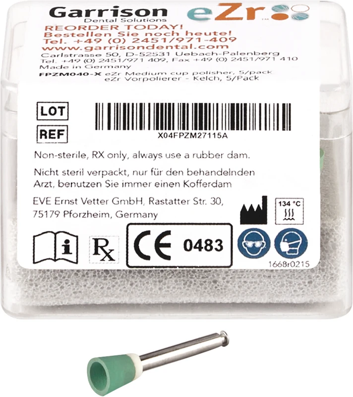 eZr ist ein Diamant-Poliersystem in drei Schritten für die Bearbeitung von Zirkonoxid und Lithiumdisilikat. Die Schleifer und Polierer sind ideal für die Bearbeitung und Korrektur von Versorgungen am Patientenstuhl, z. B. Inlays, Onlays, Veneers und Kronen.eZr Polierer haben eine lange Lebensdauer, und in Kombination mit dem hohen Materialabtrag sind sie ein wirtschaftliches und schnelles Bearbeitungssystem, mit dem Sie ohne Polierpaste in Sekundenschnelle glänzende Ergebnisse erhalten.