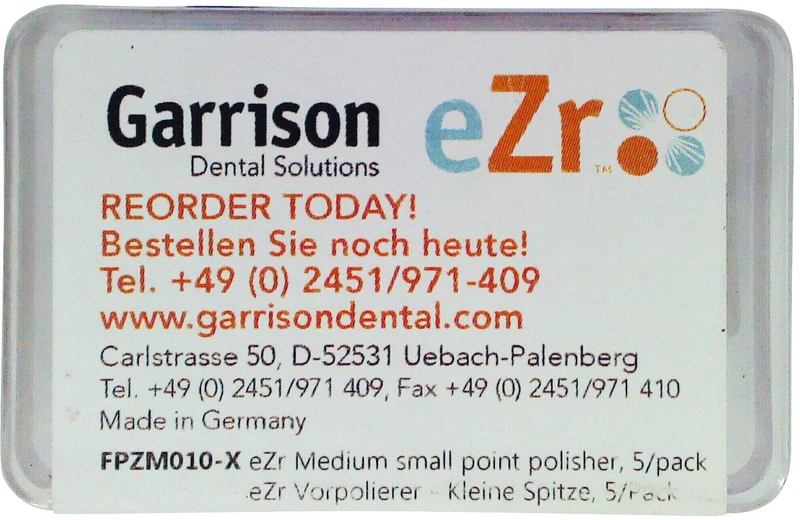 eZr ist ein Diamant-Poliersystem in drei Schritten für die Bearbeitung von Zirkonoxid und Lithiumdisilikat. Die Schleifer und Polierer sind ideal für die Bearbeitung und Korrektur von Versorgungen am Patientenstuhl, z. B. Inlays, Onlays, Veneers und Kronen.eZr Polierer haben eine lange Lebensdauer, und in Kombination mit dem hohen Materialabtrag sind sie ein wirtschaftliches und schnelles Bearbeitungssystem, mit dem Sie ohne Polierpaste in Sekundenschnelle glänzende Ergebnisse erhalten.