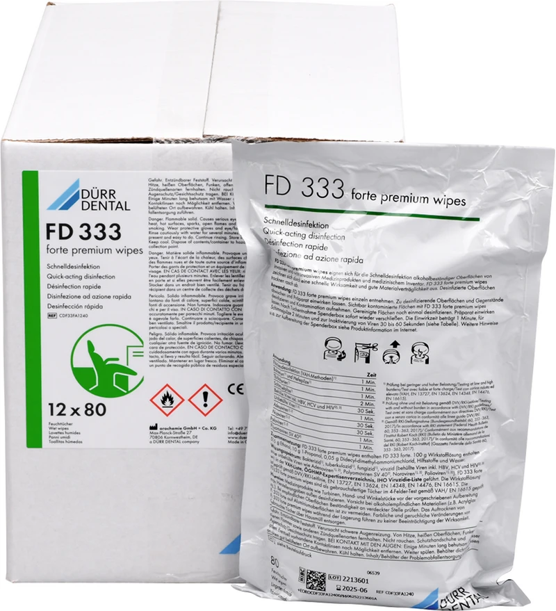 - Wirkungsspektrum: Bakterizid, mykobakterizid, tuberkulozid, levurozid, fungizid, viruzid (behüllte Viren inkl. HBV, HCV, HIV und Coronaviren sowie unbehüllte Viren wie Adenoviren, Polyomaviren SV 40, Noroviren und Polioviren). VAH-Liste, IHO-Desinfektionsmittelliste. Die Wirkstofflösung ist geprüft gemäß DVV/RKI-Leitlinie, EN 13727, EN 13624, EN 14348, EN 14476, EN 16615. Die FD 333 forte premium wipes sind als gebrauchsfertige Tücher im 4-Felder-Test gemäß VAH/EN 16615 geprüft