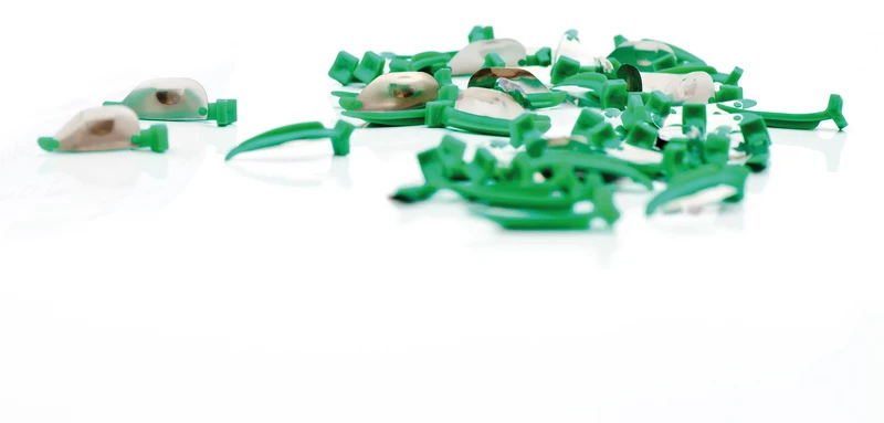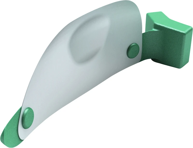 Bestehend aus Keil und Matrize wird wie ein herkömmlicher Keil platziert. Die anatomisch vorgeformte Konstruktion konturiert sich automatisch an die Zahnform. Bei der Platzierung adaptiert sich der FenderMate bleibend um die Präparation. Der flexible, seitlich angebrachte Flügel passt sich individuell dem Interdentalraum an und schafft dadurch einen dichten, cervikalen Abschluss. Der Kontaktpunkt ist bereits vorgeformt.