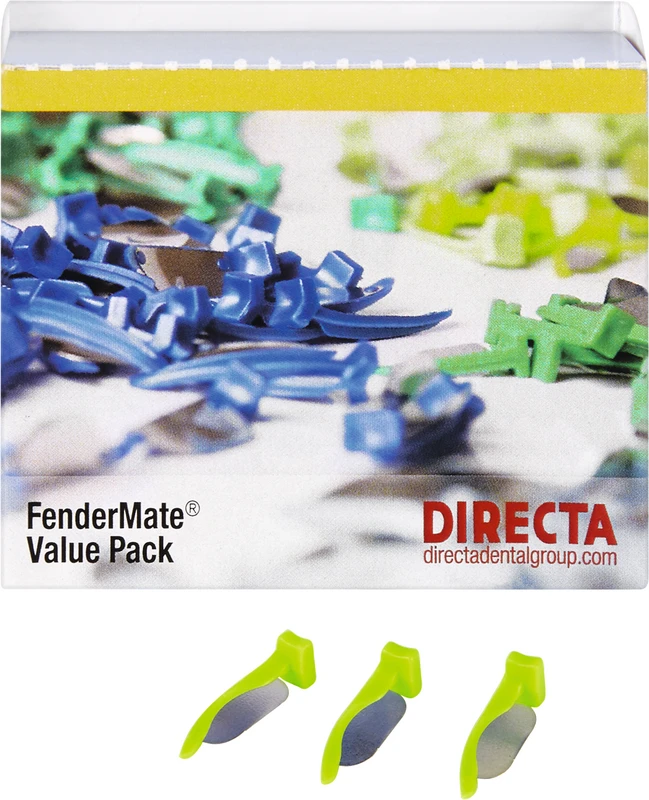 Eine einzigartige Kombination aus Präparationsschutz und Sektionalmatrize für Klasse II Füllungen von Milchzähnen. FenderPrime ist ein Kunststoffkeil mit einem Stahlblech zum Platzieren in enge Approximalräume. Die Bootsform der Spitze ermöglicht ein Zusammendrücken der Gingiva, ohne diese zu beschädigen und reduziert das Blutungsrisiko.