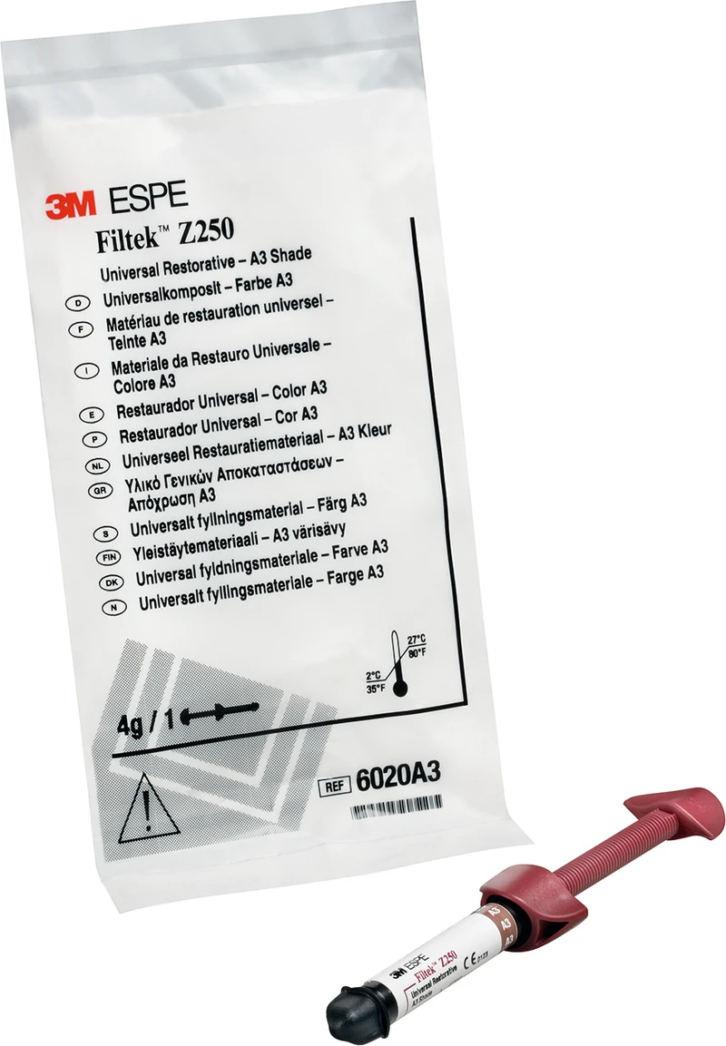 3M Filtek Z250 Universal Komposit ist das millionenfach bewährte Universal Komposit mit zuverlässiger Hybridtechnologie von 3M. Seine reduzierte Klebrigkeit am Instrument sorgt für ein optimales Handling, ein weiterer Pluspunkt sind die hohe Glanzbeständigkeit und der geringe Verschleiß. Das Filtek Z250 Universal Komposit ist in 11 Universal-Farben und einer Opak-Farbe erhältlich.