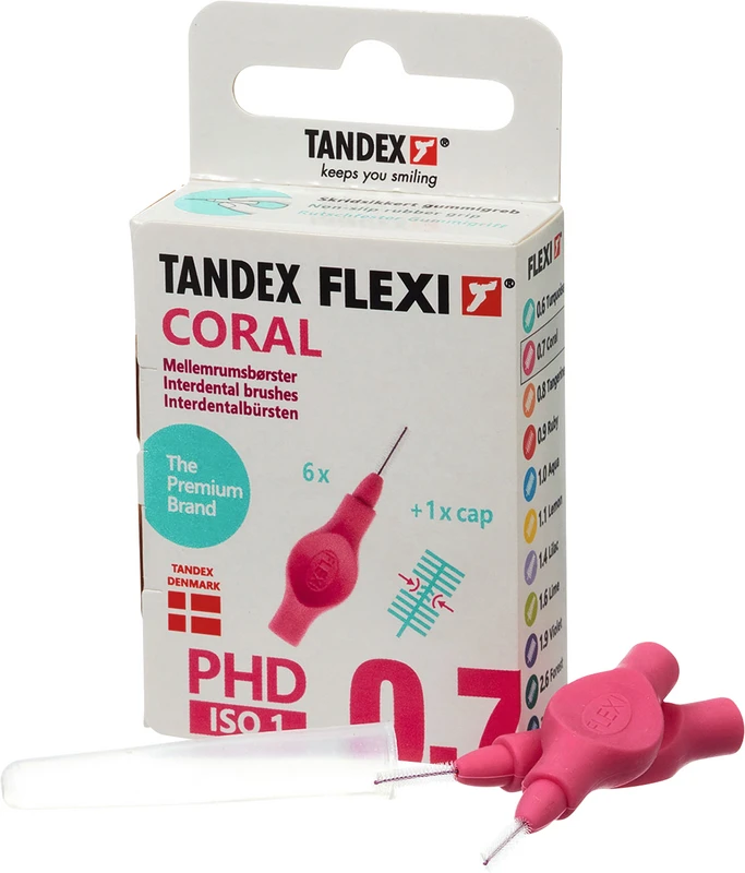 Der ergonomische Gummigriff und die weiche Soft-Griffschicht, ermöglicht einen sicheren Halt sogar wenn die Finger feucht sind. Der flexible Griff ist frei von Phtalate und trägt zu einer bequemen Reinigung in allen Interdentalräumen bei. Der kunststoffbeschichtete Draht ist ausdauernd und schützt Zahnfleisch und Zahnschmelz. 11 farbkodierte Gröen - Besonders für die tägliche Reinigung von Interdentalräumen, festen Zahnspangen und Zähnen mit Furkationsbefall. Zwei Packungsgröen aus recyclebarer FSC-zertifizierter Pappe: 6 Stück einschl. Schutzhaube. 25 Stück Value Pack einschl. Schutzhauben. FLEXI® Interdentalbürsten PHD sind in Zusammenarbeit mit dänischen Zahnärzten und Prophylaxe Assistenten entwickelt worden, um den Patienten das optimale Hilfsmittel für die Zahnzwischenraumpflege empfehlen zu können.