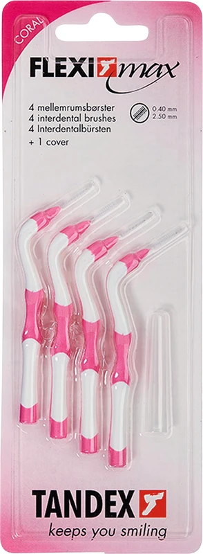 Interdentalbürsten mit verlängertem Griff. Speziell entwickelt für den erleichterten Zugang der hinteren Zahnbereiche. Vereinfachte Handhabung bei motorischen Beeinträchtigungen. Optimale Pflege von Implantaten. Geeignet für alle Altersgruppen. Angenehm und flexibel. Auswahl zwischen fünf verschiedenen Drahtstärken. FLEXI® Max Interdentalbürsten sind als 4er und 15er Packung erhältlich.