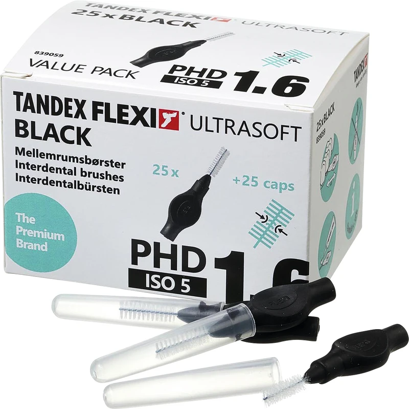 FLEXI® Ultrasoft PHD - Interdentalbürste mit sehr weichen Bürsten zur Pflege von empfindlichen Stellen, z.B. nach Zahnoperation, Chemotherapie oder für die Implantatpflege. FLEXI® Ultrasoft PHD hat einen weichen Phthalat-freien biegsamen Griff mit Kunststoff ummantelten Draht, für die präzise und schonende Reinigung. In 4 verschiedenen Gröen und als 6 oder 25 Stück Packung erhältlich.