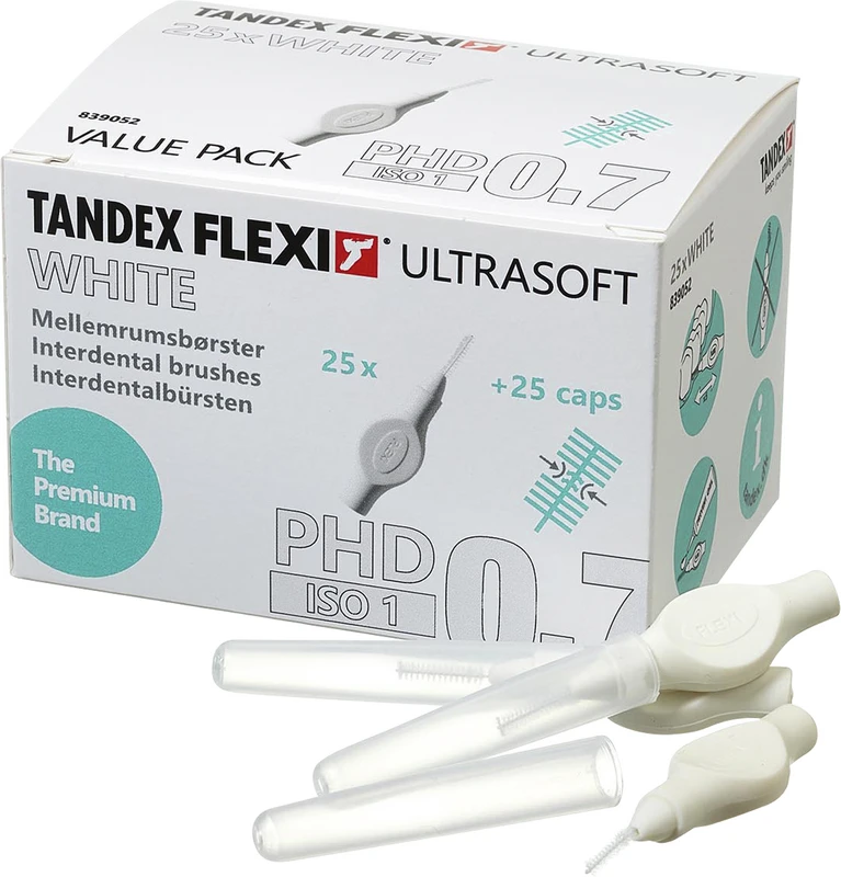 FLEXI® Ultrasoft PHD - Interdentalbürste mit sehr weichen Bürsten zur Pflege von empfindlichen Stellen, z.B. nach Zahnoperation, Chemotherapie oder für die Implantatpflege. FLEXI® Ultrasoft PHD hat einen weichen Phthalat-freien biegsamen Griff mit Kunststoff ummantelten Draht, für die präzise und schonende Reinigung. In 4 verschiedenen Gröen und als 6 oder 25 Stück Packung erhältlich.