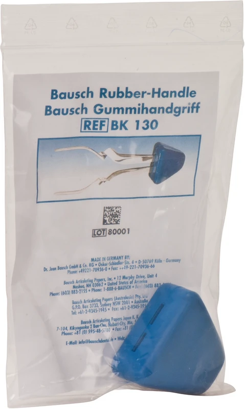 Die flexible Bissgabel ist eine Kombination aus zwei gebogenen Pinzetten BK 133 und einem Gummihandgriff BK 130. Die Pinzetten werden einfach in den Gummigriff eingesteckt und sind in diesem beweglich. Die Bissgabel eignet sich besonders zum Halten von dünnem Occlusionspapier oder Occlusionsprüffolien. Der Gummihandgriff ist bis 150 °C sterilisierbar.