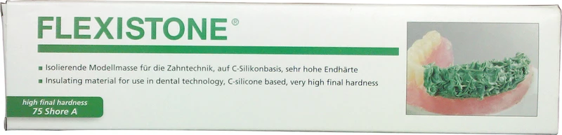 FLEXISTONE® Niedrigviskose, Isolier- und Modellmasse auf C-Silikonbasis zur isolierenden Einbettung von Kunststoff- und Porzellanzähnen. Standfest, sehr hohe Endhärte (75 shore A). Wird in einem Arbeitsgang dünn auf Zähne und Wachs aufgetragen, bildet einen dünnen, extrem harten Isolierfilm zur Fixierung der Zahnreihe beim Pressvorgang. Haftkristalle sind nicht erforderlich.