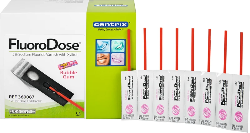 FluoroDose® enthält einen 5 %igen weißen Natriumfluorid-Kavitätenlack in der LolliPack -Einwegpackung, die maximal zulässige Fluoriddosis, und ist von der FDA für die Behandlung von Dentinüberempfindlichkeit zugelassen. Keine schmierenden Gele und unbequemen Löffel mehr; keine Angst mehr vor dem Verschlucken von Fluorid. Eintauchen. Mischen. Auftragen. Wegwerfen. Centrix macht die Fluoridlackierung sicherer und das Reinigen einfacher.