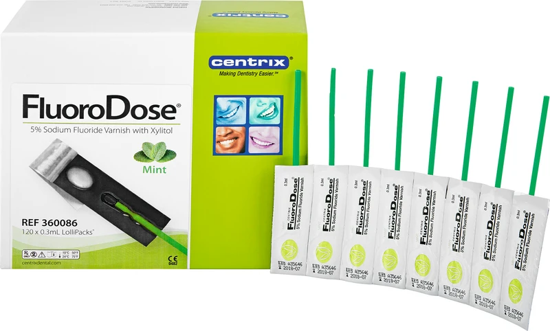 FluoroDose® enthält einen 5 %igen weißen Natriumfluorid-Kavitätenlack in der LolliPack -Einwegpackung, die maximal zulässige Fluoriddosis, und ist von der FDA für die Behandlung von Dentinüberempfindlichkeit zugelassen. Keine schmierenden Gele und unbequemen Löffel mehr; keine Angst mehr vor dem Verschlucken von Fluorid. Eintauchen. Mischen. Auftragen. Wegwerfen. Centrix macht die Fluoridlackierung sicherer und das Reinigen einfacher.