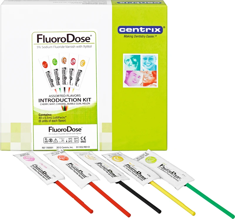 FluoroDose® enthält einen 5 %igen weißen Natriumfluorid-Kavitätenlack in der LolliPack -Einwegpackung, die maximal zulässige Fluoriddosis, und ist von der FDA für die Behandlung von Dentinüberempfindlichkeit zugelassen. Keine schmierenden Gele und unbequemen Löffel mehr; keine Angst mehr vor dem Verschlucken von Fluorid. Eintauchen. Mischen. Auftragen. Wegwerfen. Centrix macht die Fluoridlackierung sicherer und das Reinigen einfacher.