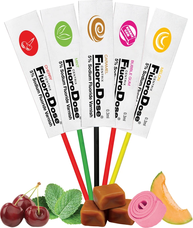 FluoroDose® enthält einen 5 %igen weißen Natriumfluorid-Kavitätenlack in der LolliPack -Einwegpackung, die maximal zulässige Fluoriddosis, und ist von der FDA für die Behandlung von Dentinüberempfindlichkeit zugelassen. Keine schmierenden Gele und unbequemen Löffel mehr; keine Angst mehr vor dem Verschlucken von Fluorid. Eintauchen. Mischen. Auftragen. Wegwerfen. Centrix macht die Fluoridlackierung sicherer und das Reinigen einfacher.