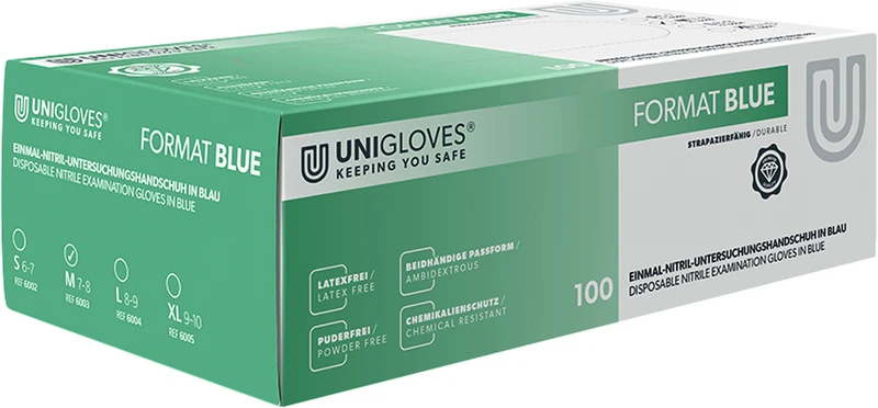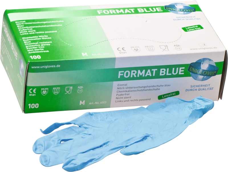 Unsterile, puderfreie FORMAT BLUE Nitrilhandschuhe.