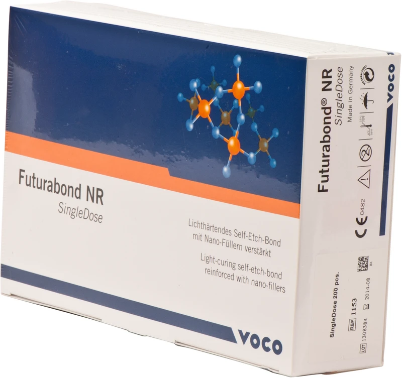 Lichthärtendes, selbstätzendes Dentin-Schmelzbond. Als Non-Etch-Bond spart Futurabond NR Zeit und ist patientenfreundlich, denn das separate, aufwendige Ätzen von Schmelz und Dentin entfällt. Futurabond NR ermöglicht vergleichbar exzellente Haftwerte auf Schmelz und Dentin wie bei der aufwendigen Total-Etch Technik. Das Bond ist entsprechend dem Wetbonding-Verfahren anzuwenden. Im Bond enthaltene Co-Polymere verleihen dem Haftungssystem elastische Eigenschaften, die starke Belastungen absorbieren und den dichten Randschluß dauerhaft sichern. Futurabond NR gibt Fluoride ab. Fluoride beugen Sekundärkaries vor. Das Bondmaterial ist universell unter allen Compomeren und Compositen einsetzbar.