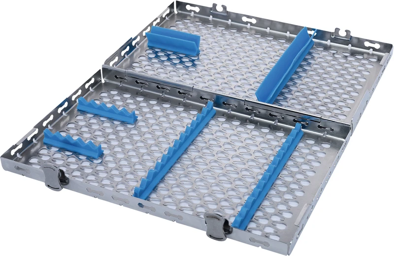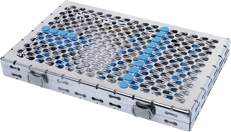 - Das neue und innovative lasergeschnittene Muster garantiert maximale Effizienz während des Reinigungs- und Sterilisationsprozesses und gewährleistet gleichzeitig Stabilität und Festigkeit der Kassette.