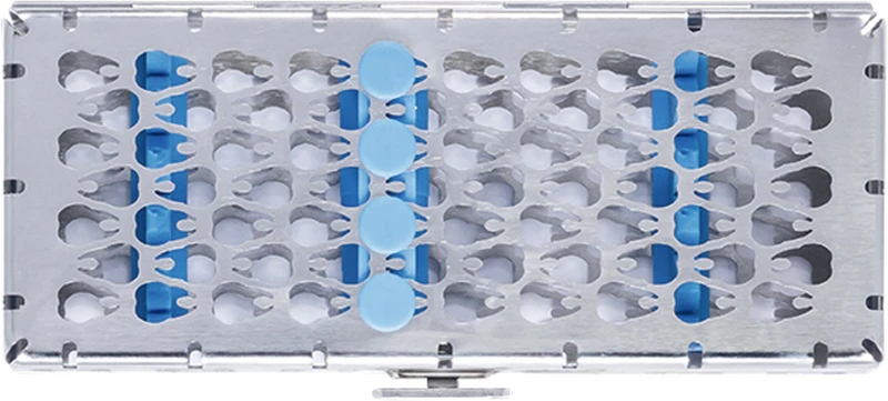 - Das neue und innovative lasergeschnittene Muster garantiert maximale Effizienz während des Reinigungs- und Sterilisationsprozesses und gewährleistet gleichzeitig Stabilität und Festigkeit der Kassette.