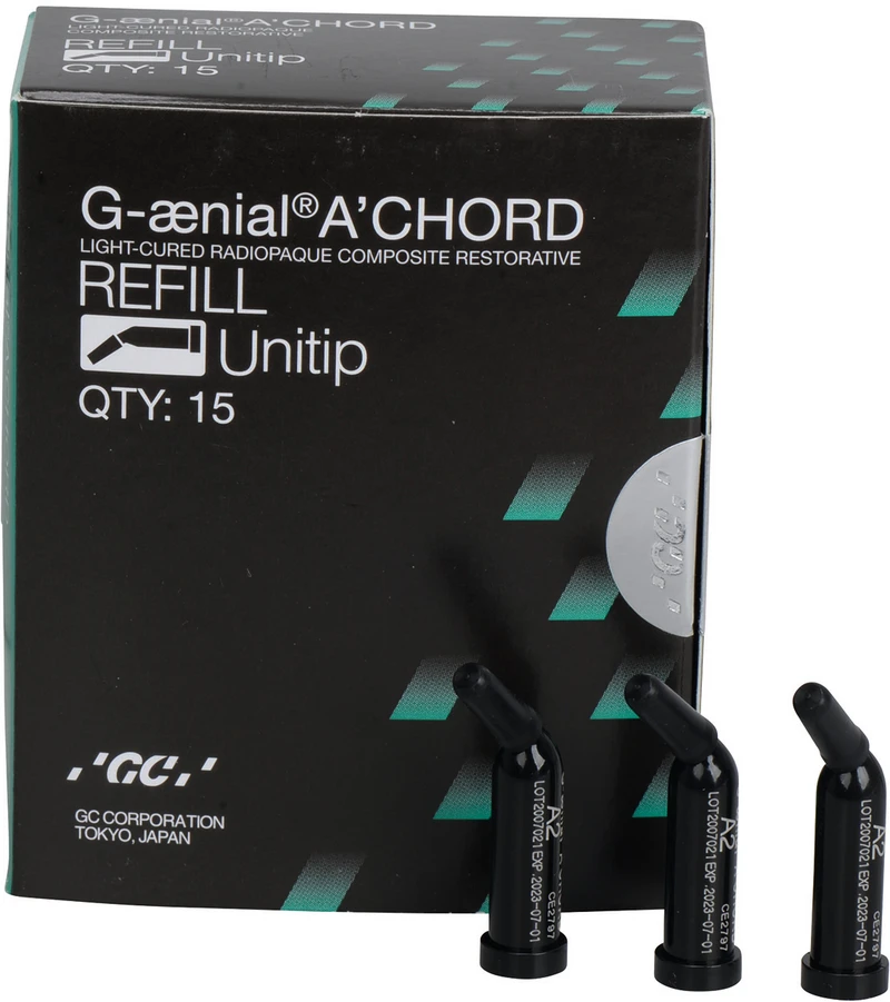 Lichthärtendes Universal-Composite-Füllungsmaterial. GC freut sich Ihnen GC G-ænial® A´CHORD, ein neues universelles Composite-Restaurationsmaterial mit einem vereinfachten Farbsystem vorzustellen drüfen: GC G-ænial® A´CHORD dank perfekter Lichtinteraktion innerhalb des Materialspektrums übergangslos in die verbleibende natürliche Zahnhartsubstanz. Universal-Farben in einer Opazitätsstufe zur Erzielung einer metameren Übereinstimmung und natürlichen Anpassungen - auch ohne Opaken oder Schmelzfarben.