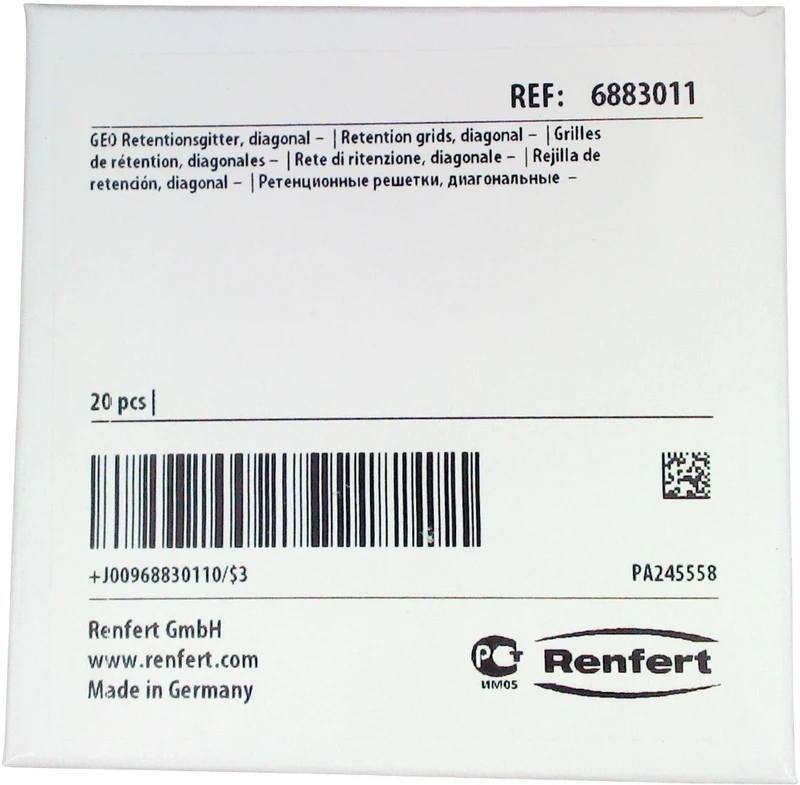 - Retentionsgitter diagonal: Hervorragende Retentionswirkung durch spezielle Struktur. Hohe Druckstabilität, leicht adaptierbar. Plattengröße 70 x 70 mm, Plattenstärke 0,95 mm