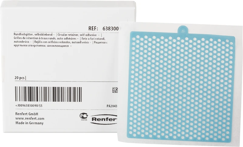 - Retentionsgitter fein: Feine Gitterstruktur mit 1,8 x 1,8 mm. Hohe Druckstabilität, leicht adaptierbar. Auch mit selbstklebender Beschichtung lieferbar. Plattengröße 70 x 70 mm, Plattenstärke 0,7 mm