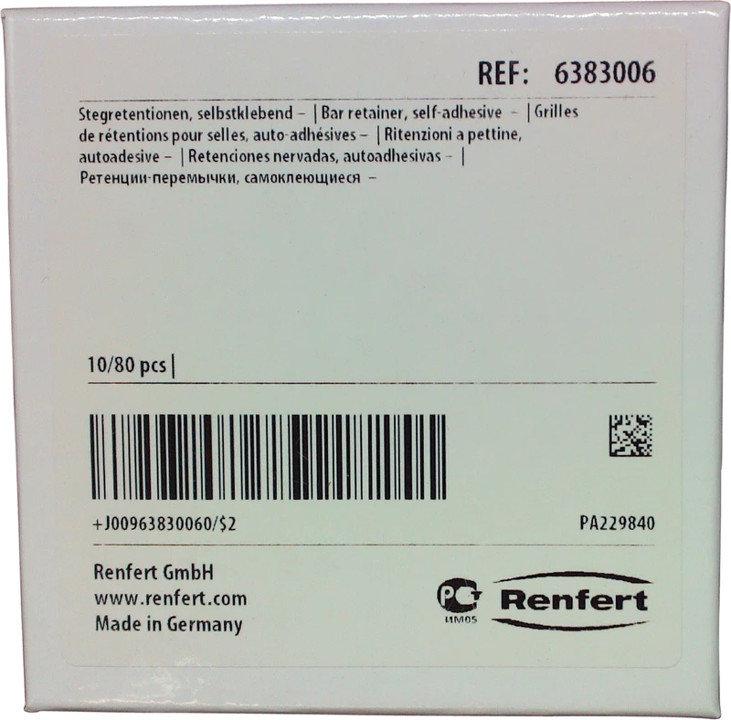 - Stegretentionen: Ideal für schmale Kieferkämme im Unterkiefer. Hohe Druckstabilität, leicht adaptierbar. Auch mit selbstklebender Beschichtung lieferbar. Plattengröße 70 x 70 mm, Plattenstärke 1,3 mm