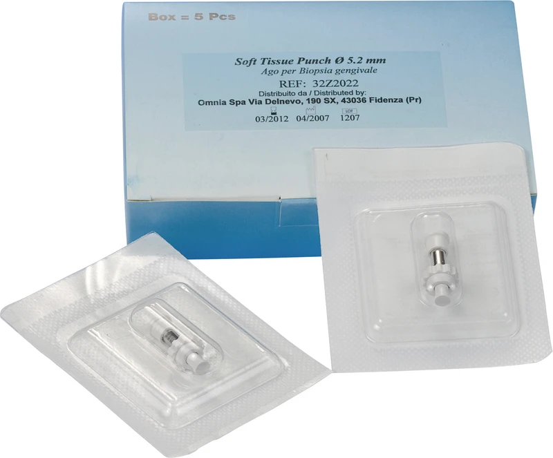Das Rundskalpell oder Mukotom für Weichgewebe ist ein Instrument, das zum kompletten Einschneiden des Schleimhautlappens mit dem Durchmesser des positionierten Implantats verwendet wird. Omnia bietet Skalpelle mit 3 verschiedenen Durchmessern an; die drei Größen erlauben ein Anpassen des Skalpells an die wichtigsten handelsüblichen Implantate. Das Einweg-Rundskalpell erzeugt ein geringeres Schleimhauttrauma als herkömmliche Skalpelle, denn der Schnitt ist auf die Abmessungen der Implantatkappe begrenzt.
