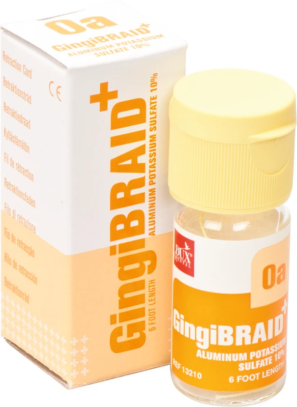 GingiBRAID+ vereinigt alle Vorteile von geflochtenen und gestrickten Fäden. Sehr gute Retraktion, GingiBRAID+ bleibt am Platz, hat nicht die Tendenz, in die Ursprungsform zurück zu gehen (memory effect). Die Fäden sind durch einen unterschiedlichen Farbstreifen leicht zu identifizieren. Geliefert wird GingiBRAID+ ungetränkt oder in Alaun getränkt.