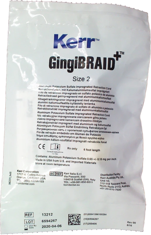 GingiBRAID+ vereinigt alle Vorteile von geflochtenen und gestrickten Fäden. Sehr gute Retraktion, GingiBRAID+ bleibt am Platz, hat nicht die Tendenz, in die Ursprungsform zurück zu gehen (memory effect). Die Fäden sind durch einen unterschiedlichen Farbstreifen leicht zu identifizieren. Geliefert wird GingiBRAID+ ungetränkt oder in Alaun getränkt.