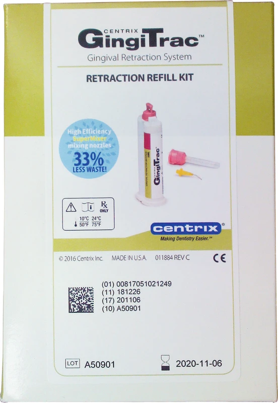 GingiTrac wurde neu formuliert und besteht jetzt aus der NEUEN 1:1-Zusammensetzung von Vinyl-Polysiloxan. Leichteres Herausdrücken aus der Automix-Pistole. Längere Haltbarkeitsdauer. Und kürzere Abbindezeit. Spritzen Sie die Retraktionspaste einfach weiterhin mit unserem patentierten NeedleTip in den Sulcus und nutzen den Bissdruck mit einem GingiCap.Verarbeitungszeit 1:30 min. Das in GingiTrac enthaltene Adstringenz kontrolliert den Sekretfluss, und das fließfähige Vinyl-Polysiloxan-Material presst die Gingiva vorsichtig an.