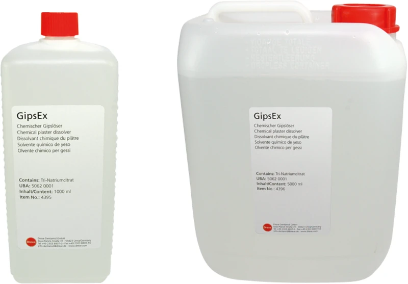 Chemischer Gipslöser zur Verwendung z. B. in der Kunststofftechnik. GipsEx ist besonders effektiv und somit zeitsparend beim Reinigen von Kunststoffprothesen, Anmischbechern, usw. Zur Verwendung in Ultraschallgeräten geeignet.