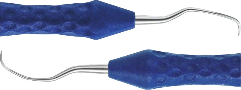 Stück Kürette Figur 13/14, 175 mm, Prämolaren, Molaren, distal, lingual, bukkal, gewinkelt, ergonomischer Griff, PEEK Griff, dunkelblau